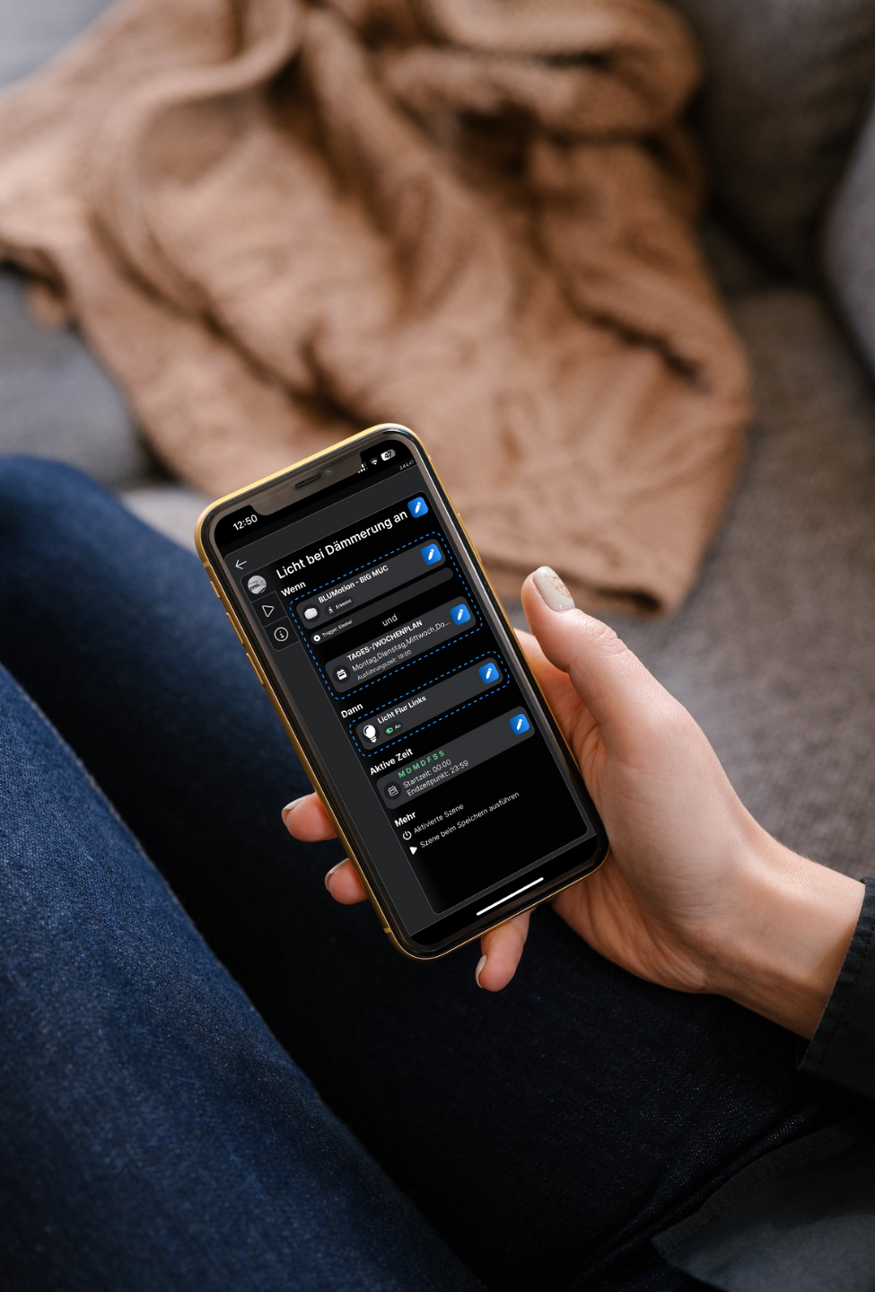 You can conveniently control your garden lighting with your smartphone - whether you're on the patio or out and about. As soon as the Shelly modules are installed and connected to the WLAN, you can switch individual lights on and off directly via the app , dim them or adjust the colour.You can also set individual time schedules in the app, for example, so that the light switches on automatically at sunset. You can also create scenes based on certain conditions, for example: If movement is detected after 10 pm, the path light switches on automatically for 5 minutes.You also retain control from a distance. When you are on holiday, you can control the light in a targeted manner and simulate your presence - this deters burglars.