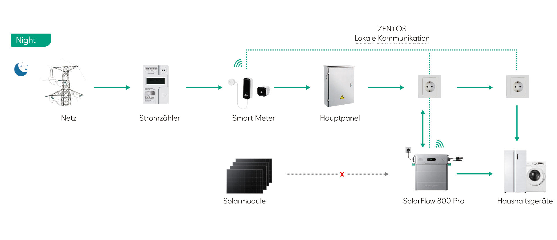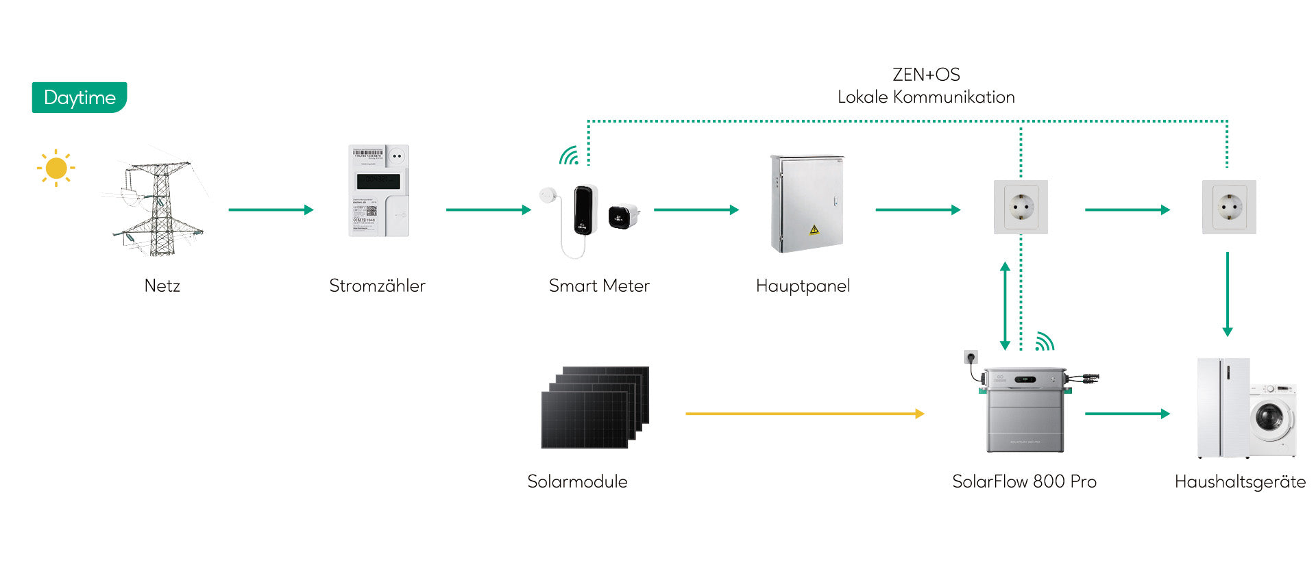 Erlebe die Leistung und den Komfort eines intelligenten Energiemanagements. Tagsüber versorgt der SolarFlow 800 Pro dein Zuhause mit Solarstrom und speichert überschüssige Energie in der Batterie. Abends liefert die Batterie Strom zurück an dein Zuhause. Dieses effiziente Energiemanagement senkt deine Abhängigkeit vom Stromnetz – und spart dir bares Geld.