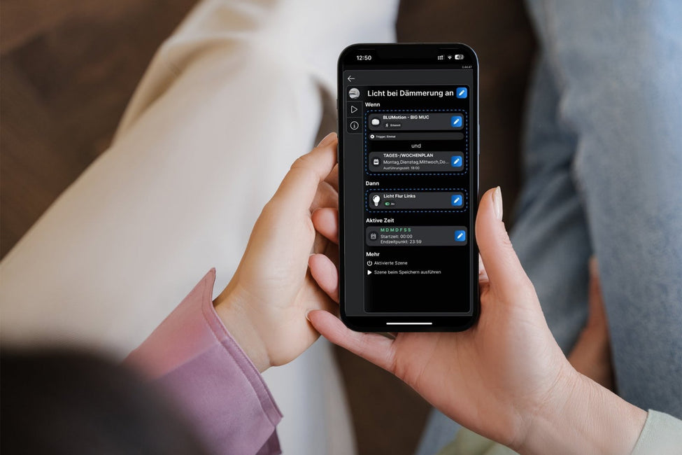 Its LUX sensor measures the ambient brightness and adjusts the light output. You can do this by simply defining the corresponding scene in the app. The motion sensor recognises whether someone is nearby.