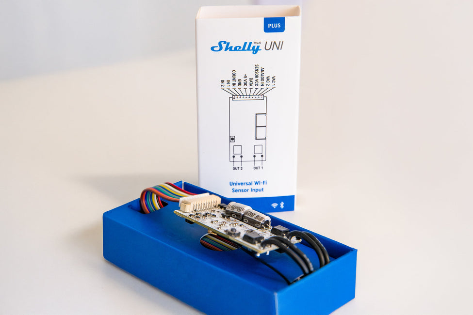 Now that we have highlighted the advantages of a networked doorbell, the question arises as to how a smart doorbell can be integrated. If you are now thinking that the entire doorbell system needs to be replaced and complex wiring is imminent, can rest assured: It's easy with the Shelly Plus Uni. The small module is especially suitable for devices with low-voltage AC and DC applications and enables them to be controlled via the smart home. It has two solid-state relays with potential-free contacts, a pulse counter, one analog, and two digital inputs.
