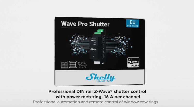 Professional DIN rail Z-Wave® shutter control with power metering. Suitable for home and facility automation with remote control of motorized blinds, roller shutters, venetian blinds, awnings..