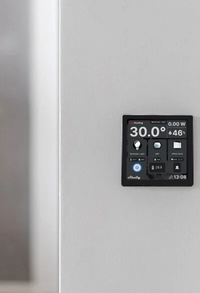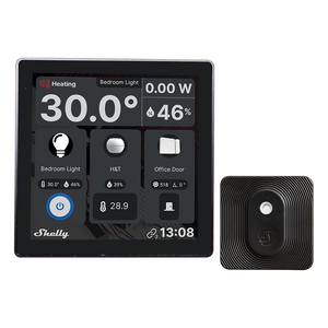 Shelly Wall Display is a sophisticated 4-inch display that brings intuitive control and seamless monitoring to every corner of your smart home. Whether it's dimming the lights, adjusting the room's ambiance, or ensuring optimal energy efficiency, this smart control panel makes home management simple. The highly customizable home screen becomes a reflection of your preferences, offering a quick glimpse of essential home details. Together with Shelly BLU H&T, it can function as a smart thermostat, allowing you to easily fine-tune your heating or cooling.